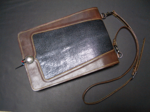 A4サイズ、こげ茶の革、エイ革とのコンビネーション。